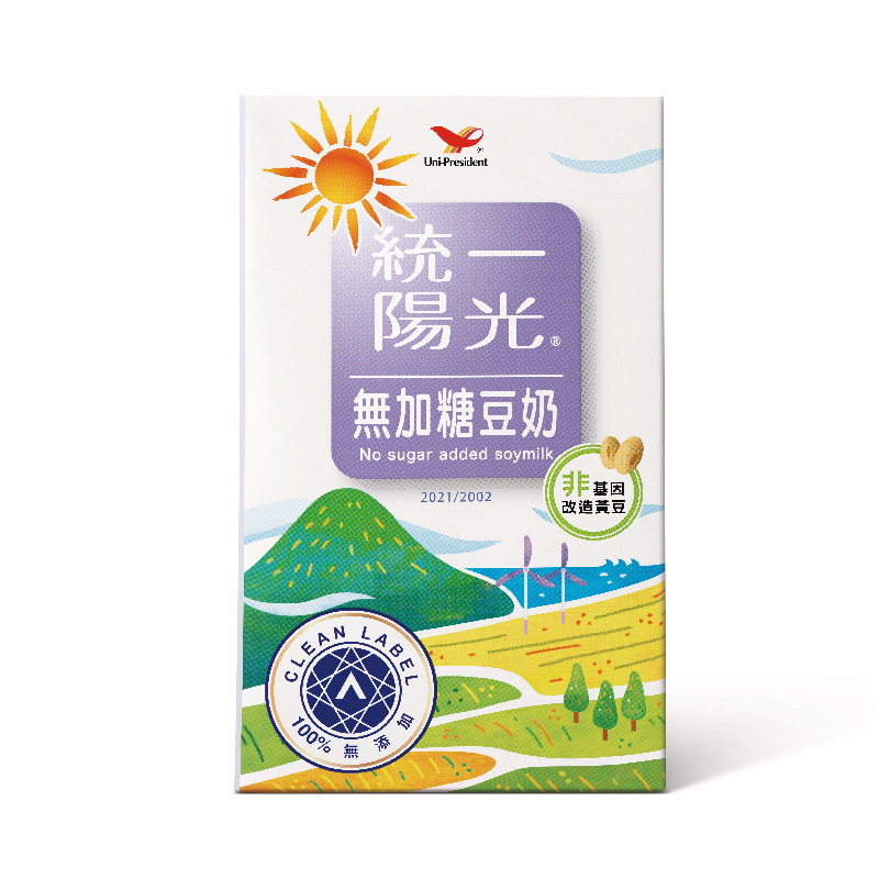 統一陽光無加糖豆奶,原料只有黃豆和水,為台灣首瓶獲A. A. Clean Label驗證最高級別100%無添加,及全球純粹風味評鑑三星最高殊榮頂級美味的優質豆奶。