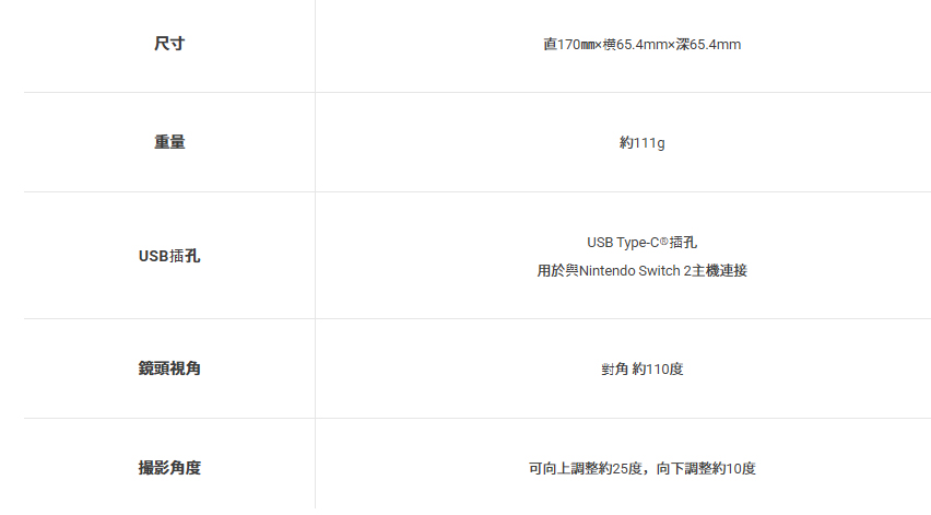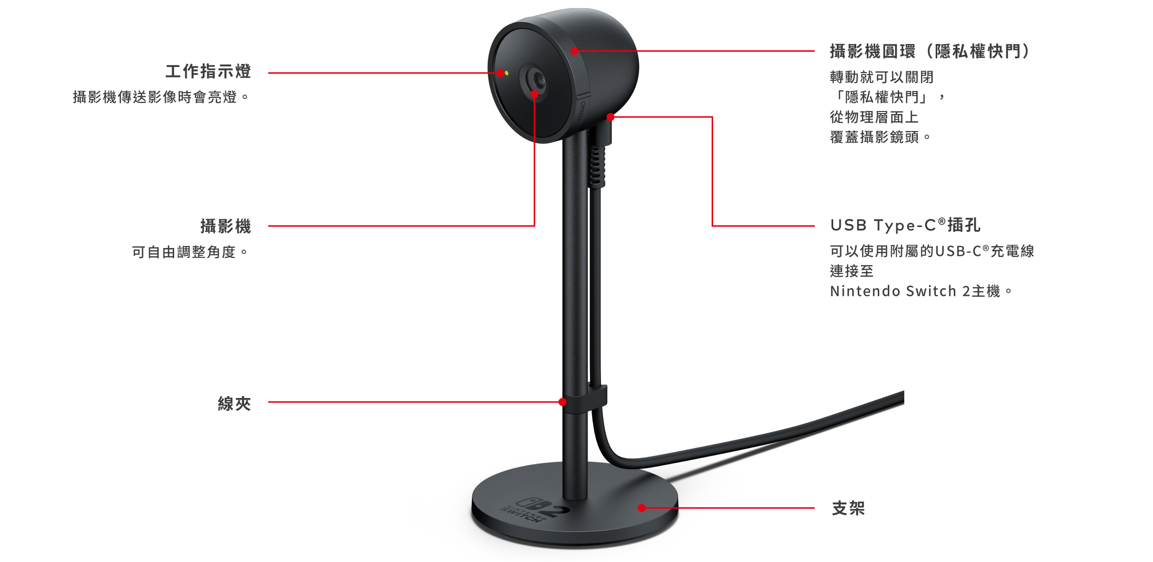 Nintendo Switch 2 專用的 USB 攝影機。不管是 TV 模式、桌上模式還是手提模式,只要把附屬的 USB-C 充電線連接至主機,就能輕鬆進行視訊通話。部分遊戲支援「攝影機玩法」,能讓自己的身影作為玩家出現在遊戲中。