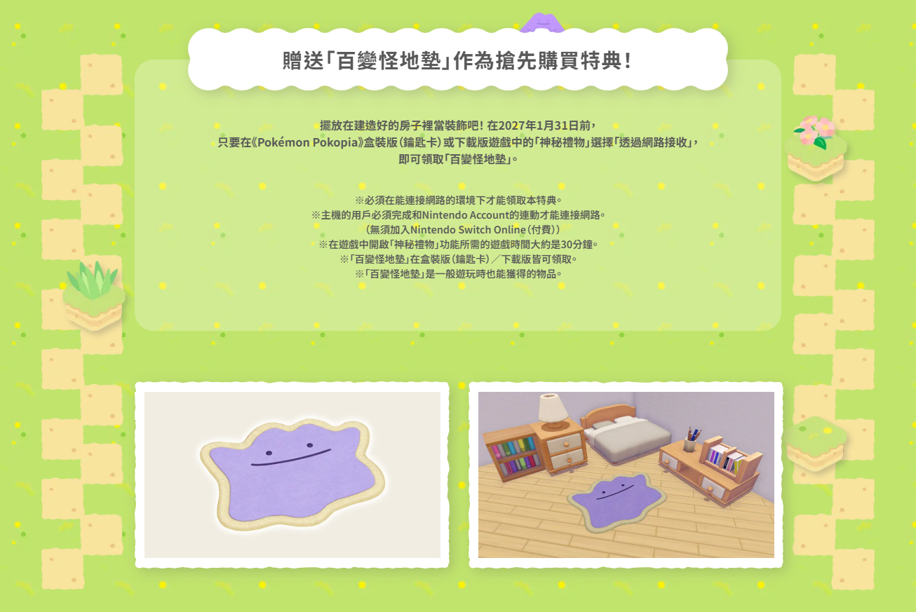 .「《Pokémon Pokopia》遊戲內物品 “百變怪地墊”」。(可擺放在建造好的房子裡當作裝飾)