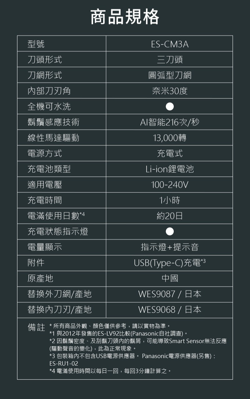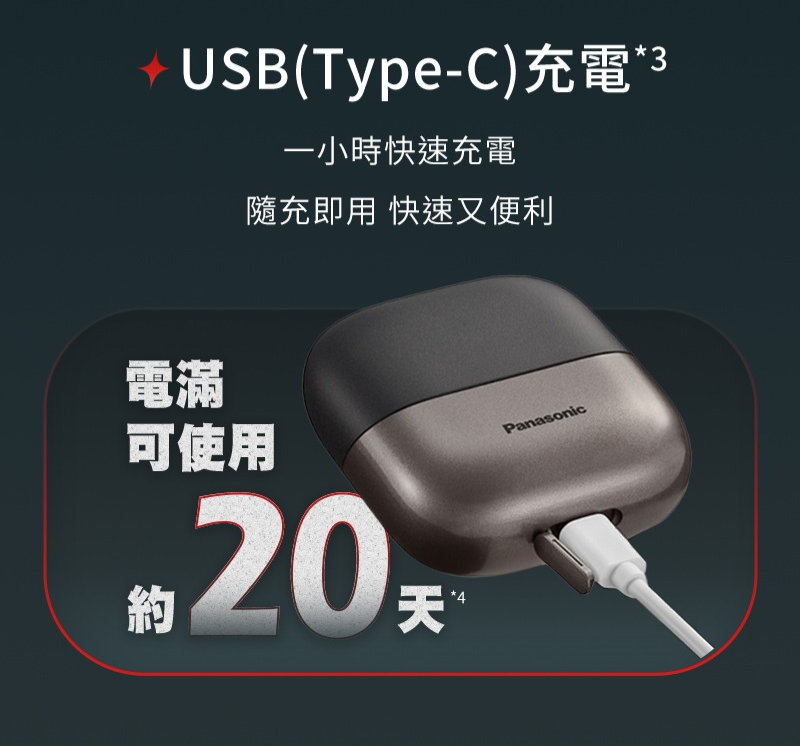 ● 包裝箱內不包含USB電源供應器。 Panasonic電源供應器(另售):ES-RU1-02