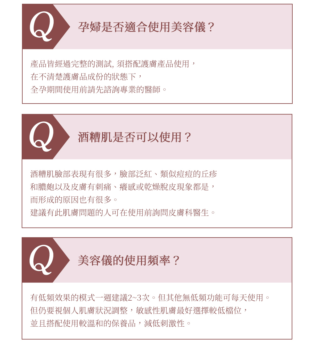 但其他無低頻功能可每天使用。但仍要視個人肌膚狀況調整,敏感性肌膚最好選擇較低檔位,並且搭配使用較溫和的保養品,減低刺激性。