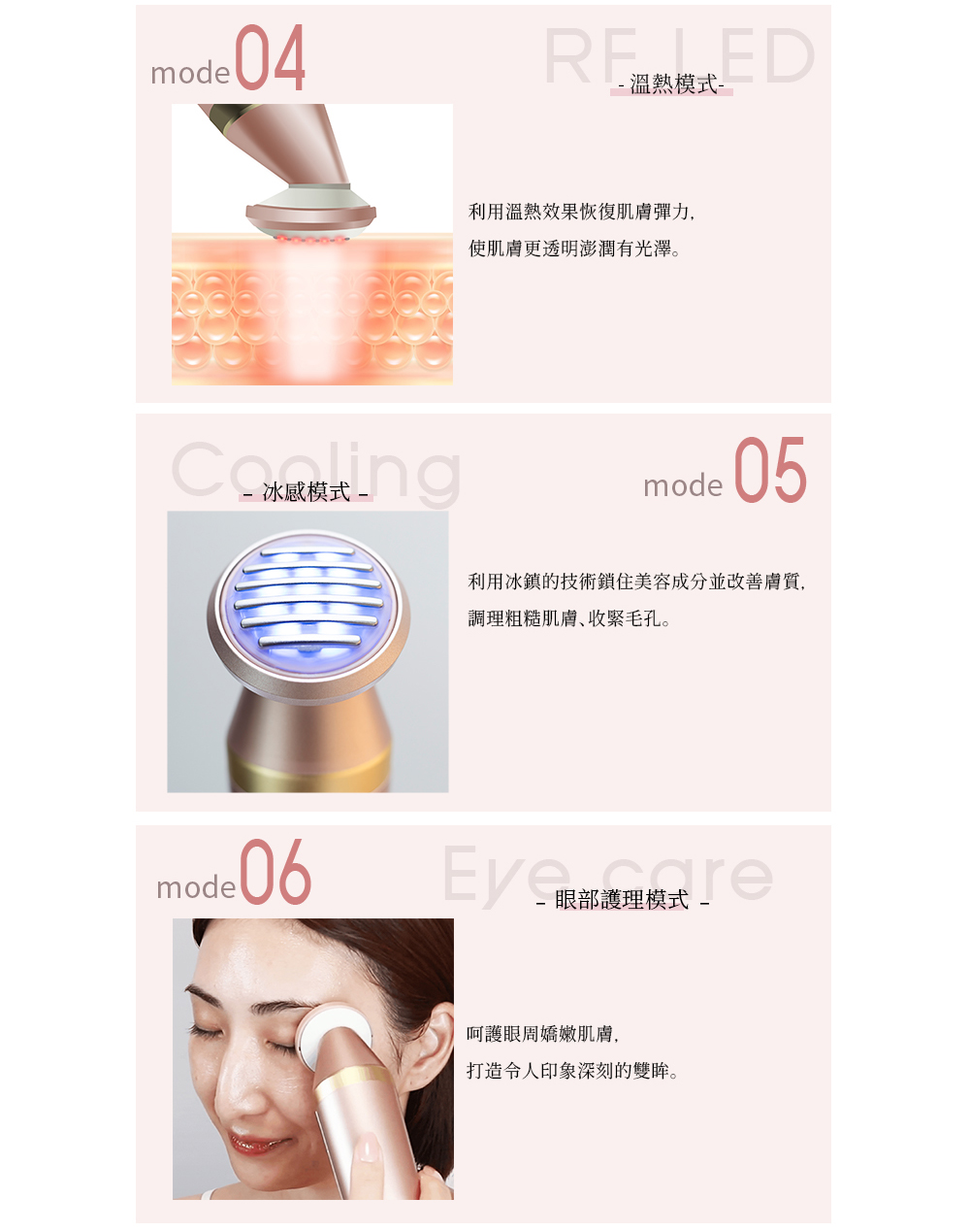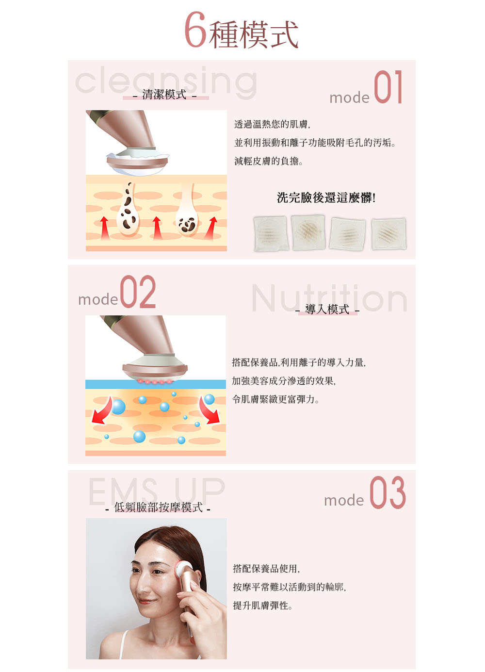 1. 6大模式:清潔模式、導入模式、低頻臉部按摩模式、溫熱模式、冰感模式和眼部護理模式。
