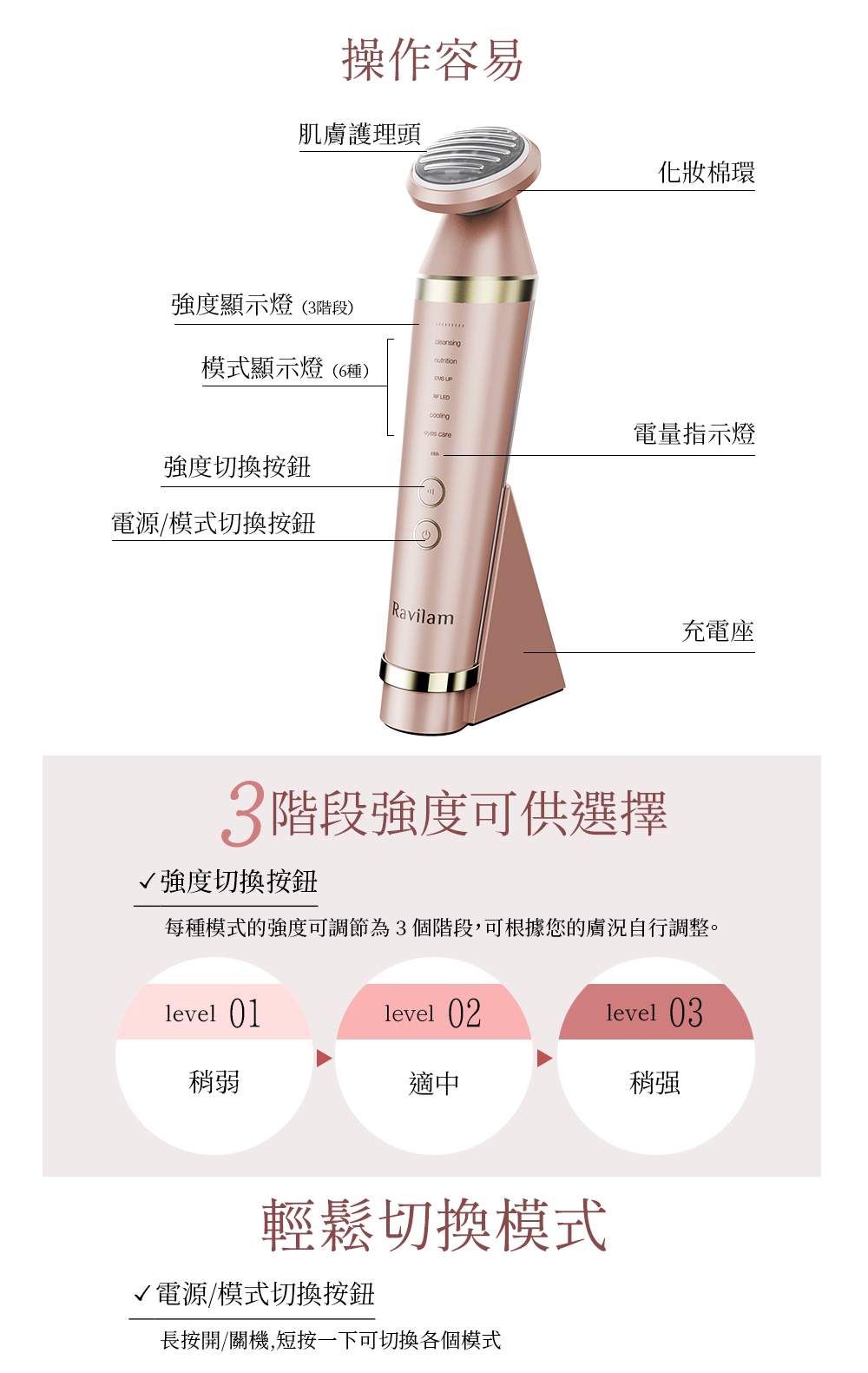 2. 強度可調:共三階段強度可調整,可根據皮膚狀況調整每個模式的強度。