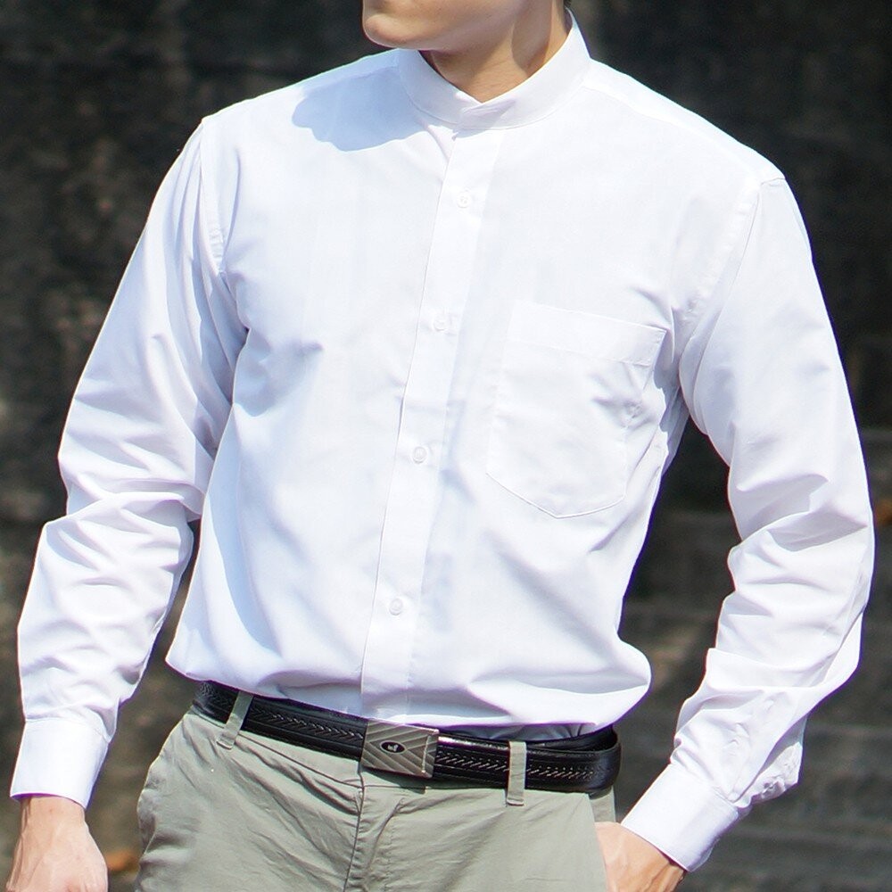 【CHINJUN】勁榮抗皺襯衫-長袖 亨利領 素面白色 立領 中山領 台灣現貨 男襯衫 商務 口袋 硬領