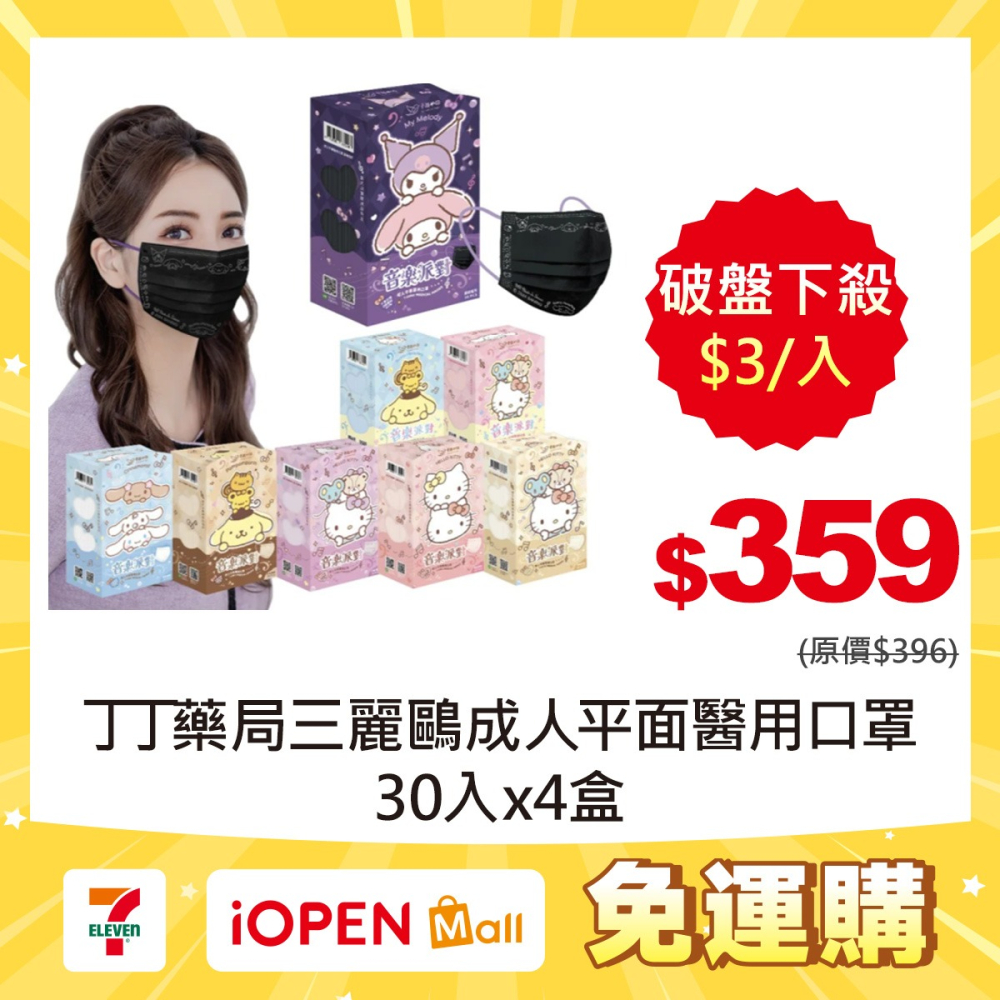 【7-ELEVEN 門市團購】【丁丁藥局】三麗鷗成人平面醫用口罩 30入 4盒組