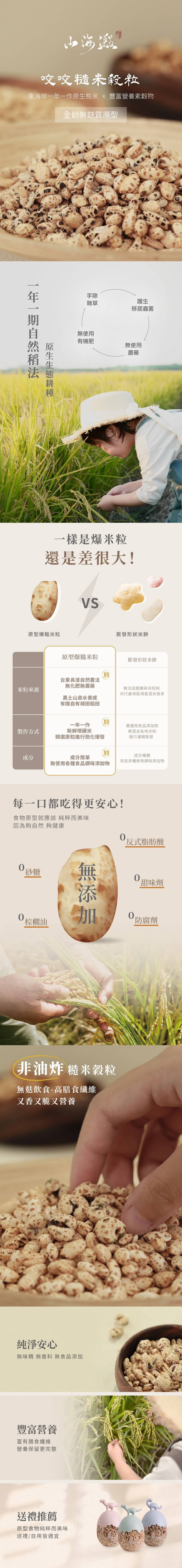 非油炸食品,使用傳統麥芽糖,加上糙米/黑糙米/白米,並選用保持傳統用的大豆油(非合成),再添加靠海的鹽,將口感做至不黏牙且飽含米的香氣!