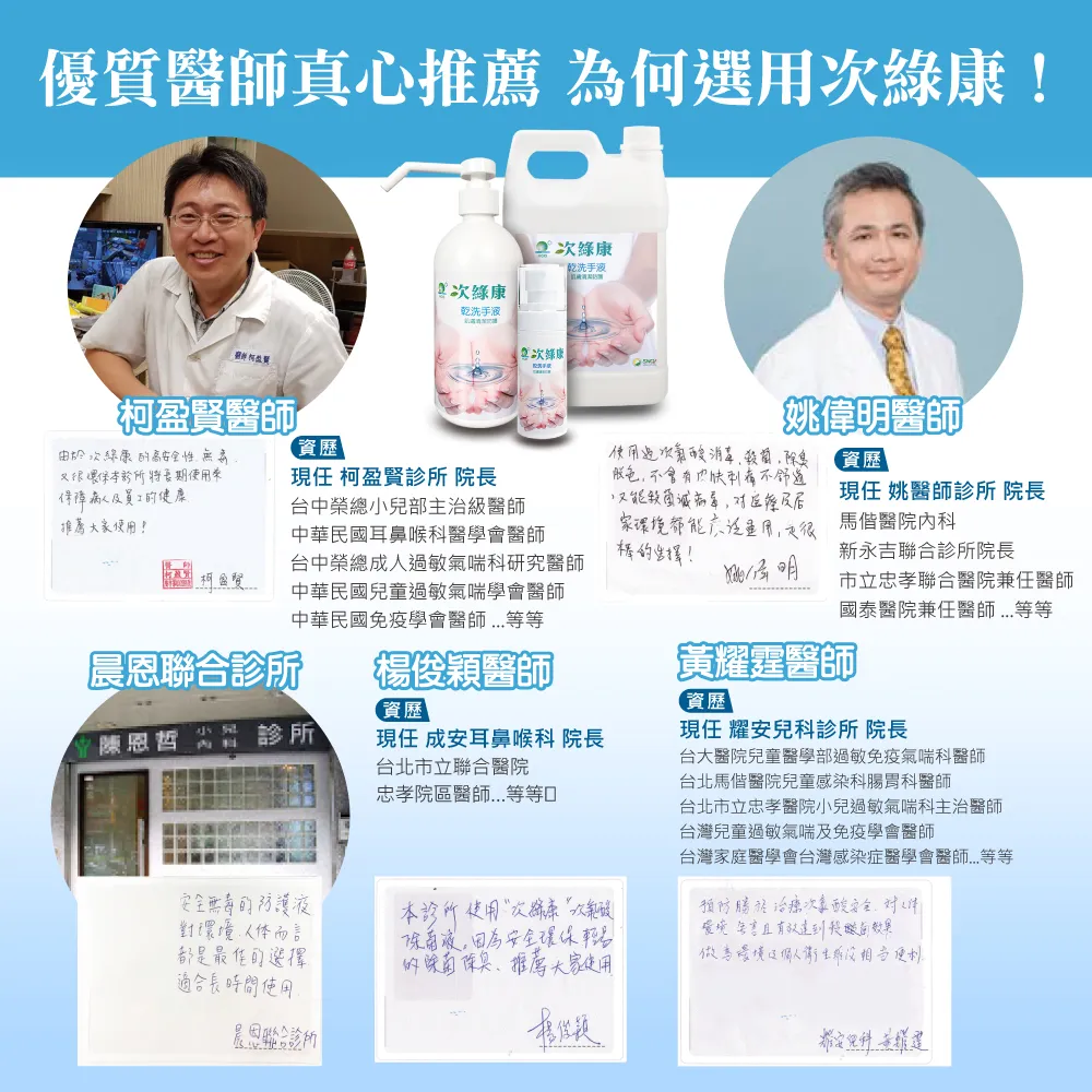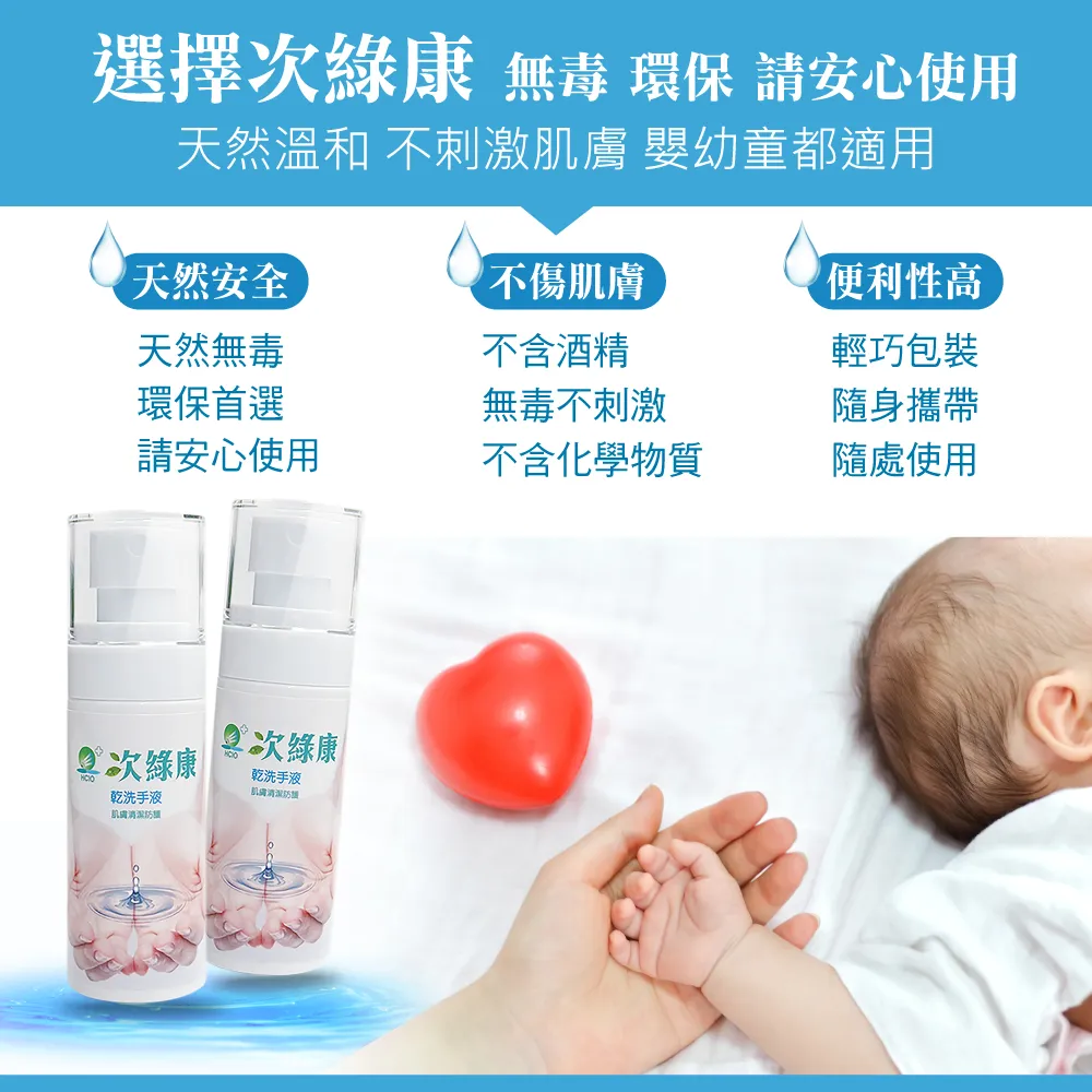 次綠康乾洗手液採用電解食鹽製成的次氯酸水(HClO),清潔力高達傳統漂白水的80倍 1,卻無刺激、無殘留、對環境友善,是日常防護的安心選擇。✅ 產品特色: