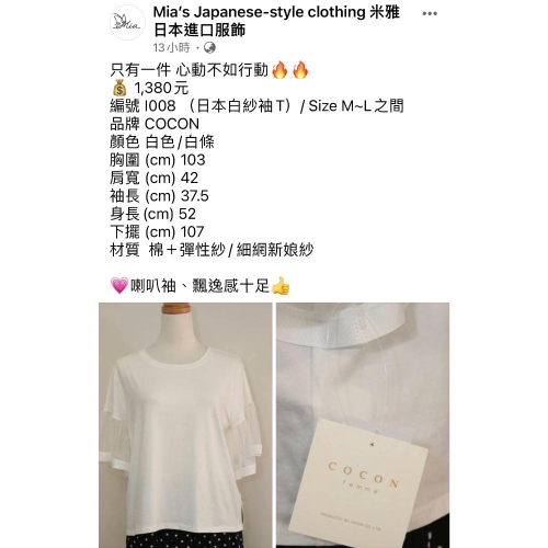 編號 I008 (日本白紗袖T)/ Size M~L之間