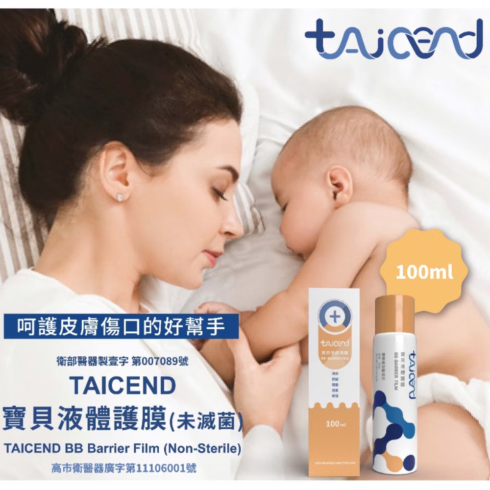 “TAICEND液態皮膚保護膜”噴塗於皮膚後,形成一層具有透氣、防水、速乾、安全無毒、無刺激性等特性的皮膚保護薄膜,可用來保護皮膚,避免因膠帶撕除時造成的皮膚損傷,亦可用來隔絕膠帶、分泌物、糞便及尿液髒污所造成之皮膚刺激;”TAICEND液態皮膚保護膜”也可提供一般外傷、小型傷口及易摩擦處之皮膚部位等處快速且有效的防護,阻隔水或是細菌的侵入,預防傷口感染,特別適用於一般敷料無法服貼的關節部位之照護。