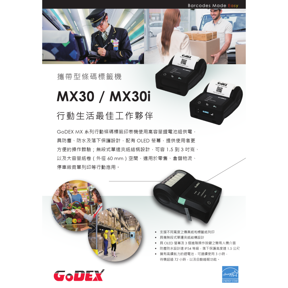 GoDEX MX系列行動條碼標籤印表機使用高容量鋰電池組供電,具防塵、防水及落下保護設計,配有LED螢幕,提供使用者更方便的操作體驗;無段式單邊夾紙結構設計,可容1.5到3吋寬、以及大容量紙卷(外徑60mm)空間,適用於零售、倉儲物流、停車繳費單列印等行動應用。