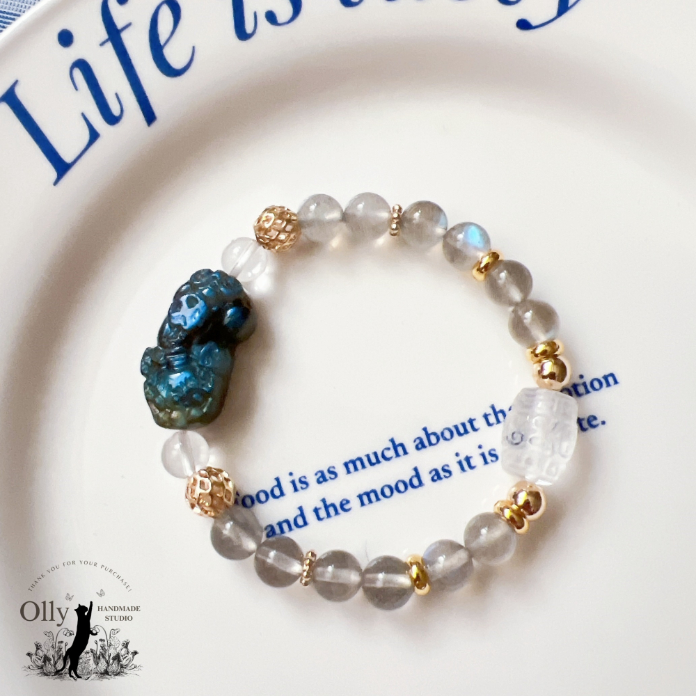 ■ 材質 7.8mm+ 灰拉長圓珠 / 7.5mm白水晶 / 白水晶回紋珠 / 14金配飾 )