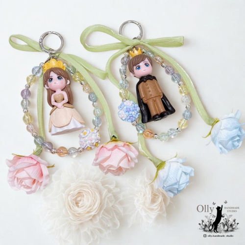 【Olly】童話戀人 王子公主 娃娃掛飾 吊飾 鑰匙扣 人偶吊飾 生日禮物 串珠 玫瑰花 車掛 情人節 戀人