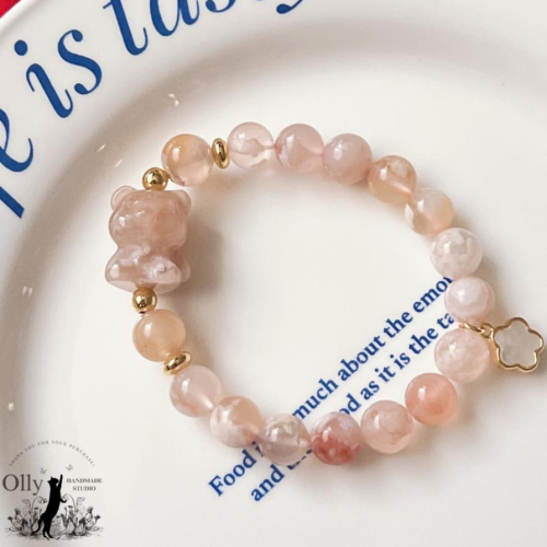 【Olly】設計款【春櫻小熊】粉櫻花瑪瑙 深海珠貝小花 彈性手鍊 設計手鍊 手串 情人節 母親節 生日禮 交換禮物