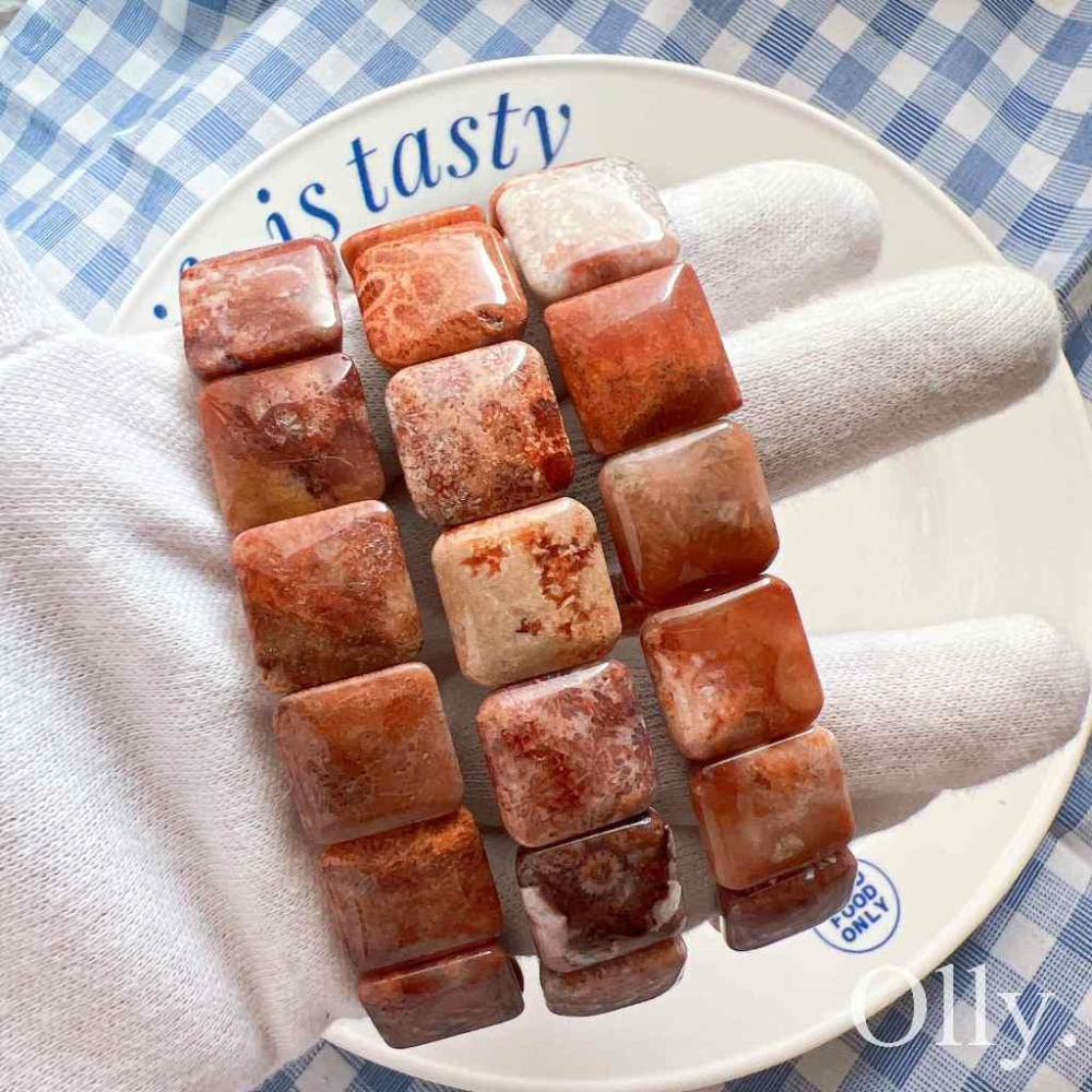 【Olly】珊瑚玉手排【濃色潤感小正方】彈性手排 手鍊 手環 菊花石 珊瑚玉 生日禮物 交換禮物 聖誕節 收藏 ST