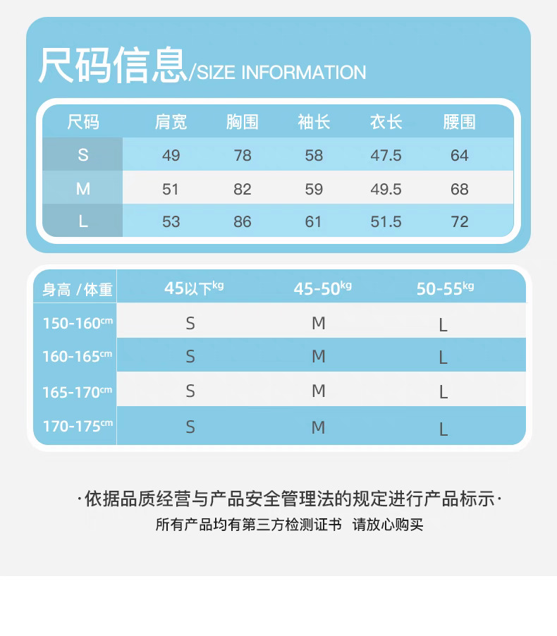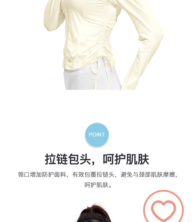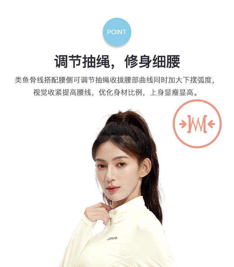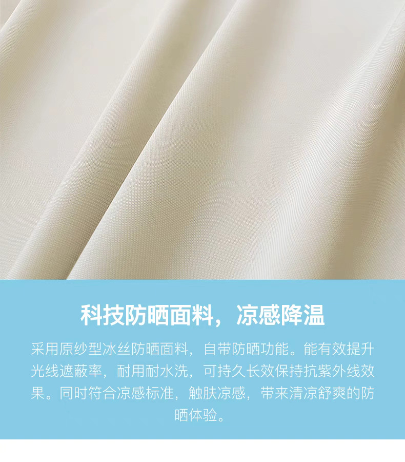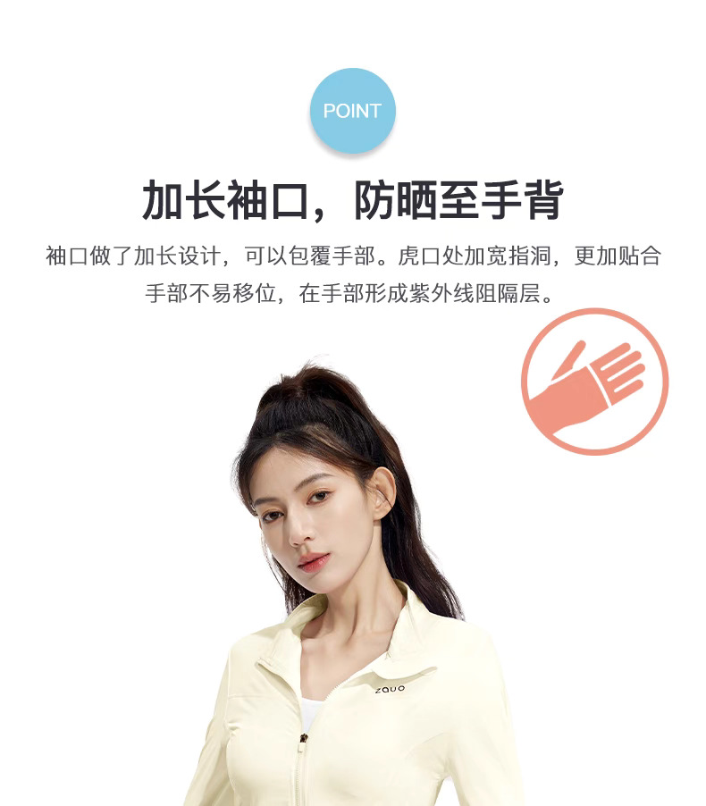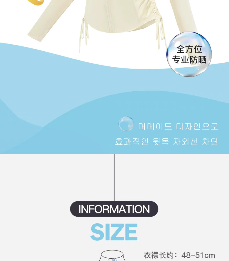 科技防曬面料,凉感降溫❄️ 採用原紗型冰絲防曬面料,自帶防曬功能。 能有效提升光線遮蔽率,耐用耐水洗,可持久長效保持抗紫外線效果。 同時符合凉感標準,觸膚凉感,帶來清凉舒爽的防曬體驗。 調節抽繩,修身細腰 類魚骨線搭配腰側可調節抽繩收攏腰部曲線同時加大下擺弧度,視覺收緊提高腰線,優化身材比例,上身顯瘦顯高。 拉鍊包頭,呵護肌膚 領口新增防護面料,有效包覆拉鍊頭,避免與頸部肌膚摩擦,呵護肌膚。 加長袖口,防曬至手背 袖口做了加長設計,可以包覆手部。 虎口處加寬指洞,更加貼合手部不易移位,在手部形成紫外線阻隔層。 品牌LOGO Brand logo 加長袖口Lengthening cuffs 防護面料Protective fabric 調節抽繩Adjusting drawstring ⚠️⚠️⚠️退換貨注意⚠️⚠️⚠️ ⚠️個人衛生用品因為衛生問題,開封後即無法退貨,請見諒!