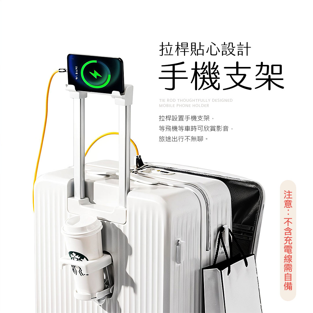 拉桿設置手機支架,等車時追劇、視訊超方便,讓旅途不無聊。