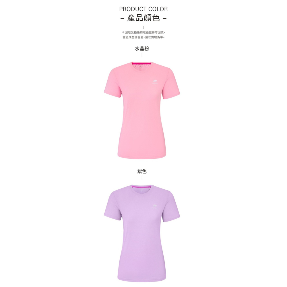 商品描述: 女休閒提花圓領T恤 紫色451083 水晶粉351083 尺寸均為。 商品編號:10159390。 商品特色:吸濕速乾、柔軟親膚、透氣舒適、伸縮彈性。 商品規格:材質聚酯纖維88%、彈性纖維12%注意事項產品顏色會因燈光拍攝和電腦螢幕等因素, 會造成些許色差,請以實物為準商品貨號451083。