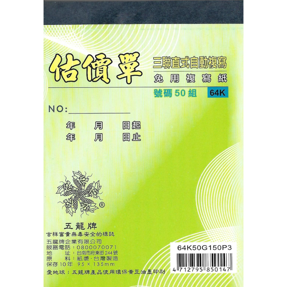 三聯直式估價單非碳複寫紙 每本150張/50組/超大本 上白中紅下藍 送貨單 附號碼 64K 五龍牌