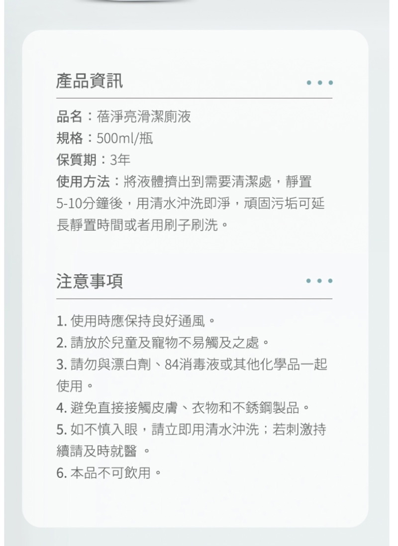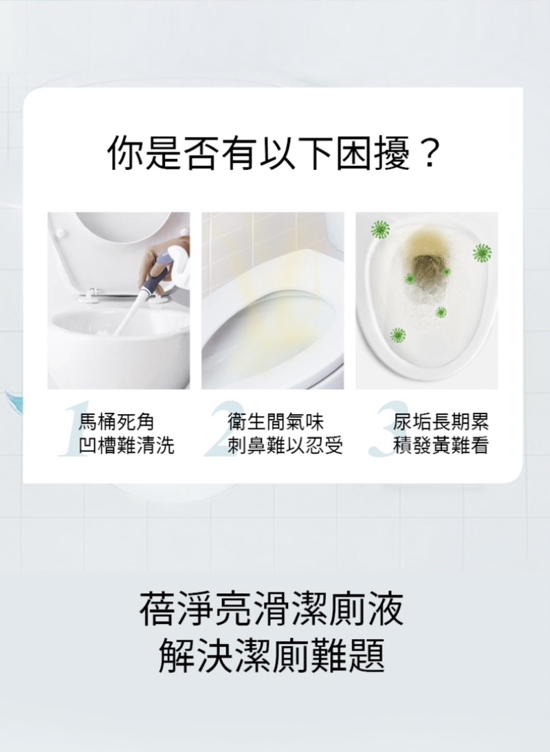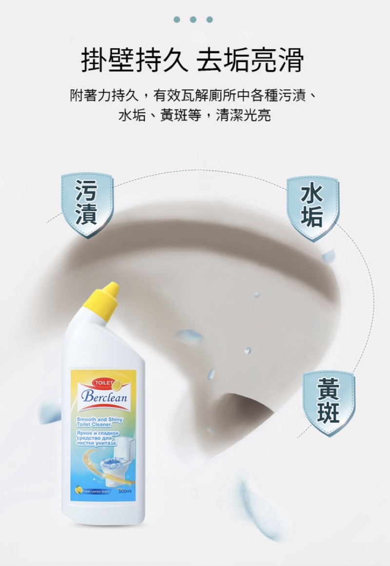 附著力持久,有效瓦解廁所中各種污漬、水垢、黃斑等,清潔光亮 不傷釉面 溫和去污