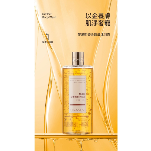 花貓|有現貨꧂黎漫熙 鎏金寵膚沐浴露/400ml-Gilt Pet Body Wash 以金養膚 肌淨奢寵 黎漫熙鎏金寵膚沐浴露 🤗金箔添加Gold foil addition 🤗植萃精華Plant extract 🤗溫和清潔Gentle cleaning 🤗潤澤養膚Skin nourishing 成年人應當如何紓解疲憊的一天? 不如,洗個澡吧! 你需要 被熱水包裹被泡沫親吻被香氣營繞 讓身體解脫束縛 讓靈魂得以放鬆 生活未必事事如意 至少在洗澡的時刻 您可以寵愛自己 給身體 「穿金戴銀」 看得見的金箔 觸得到的奢寵 養膚、寵膚、悅膚 上上榮寵 唯你獨尊 良心沐浴露最基礎的需求 我們都出色完成了 ꧁植萃꧂ 巨藻萃取物 龍舌蘭莖萃取物 泛醇 煙醯胺 覆盆子果萃取物 ꧁洗得乾淨 不乾澀 ꧁潤澤肌膚 不假滑 ꧁泡沫細膩 易沖洗 普通沐浴露不捨得放的成分 我們足量添加 龍舌蘭莖萃取物 安撫鎮靜敏肌选用 覆盆子果萃取物 額外添加多種有效成份 讓洗澡不止乾淨而已 雲朵感綿密泡泡 帶走疲憊 浴見輕鬆 不但能淨膚排濁 更是充滿幸福感的柔浴新體驗 ▲使用方法1 ▲ 濕潤肌膚後,取適量沐浴露用手或者沐浴球搓出豐富泡沫, 均勻塗抹於全身,輕柔按摩片刻後,用清水洗淨即可。 ▲使用方法2 ▲ 在浴缸中倒入適量沐浴露,用熱水衝出大量泡沫,到達浴缸2/3處時,即可奢享鎏金泡泡浴。 大牌香水級香氛 呵護你的沐浴心情 都是清爽青檸香 🤗黎漫熙鎏金寵膚沐浴露🤗 品牌:黎漫熙 名稱:鎏金寵膚沐浴露 規格:400ml/瓶 保質期:3年 注意:避免接觸眼睛,若接觸眼睛,請用水沖洗。 本產品僅供肌膚外用,如有不適,請停止使用。