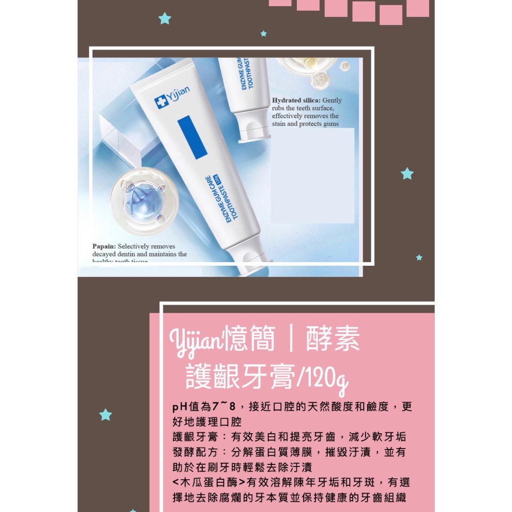 憶簡酵素護齦牙膏/120g pH值為7-8,酸度弱,接近口腔的天然酸度和鹼度,更好地護理口腔 精細泡沫,去除口腔殘留物 使用細泡沫,該產品可以滲透到牙齒之間的縫隙中,作為牙齒的SPA,並去除牙垢、牙菌斑和汙漬 強度強,高活性發酵的能量 普通牙膏:難以去除牙齒汙漬,使牙齒變得虛弱 護齦牙膏:有效美白和提亮牙齒,減少軟牙垢