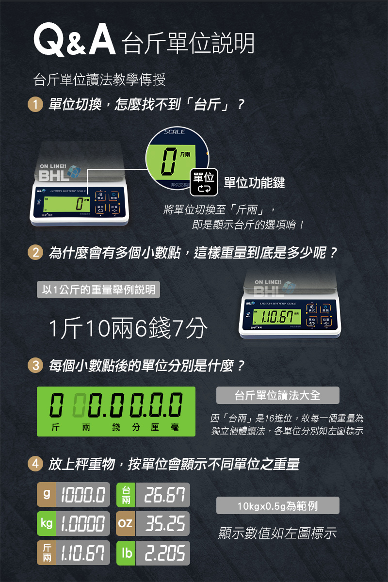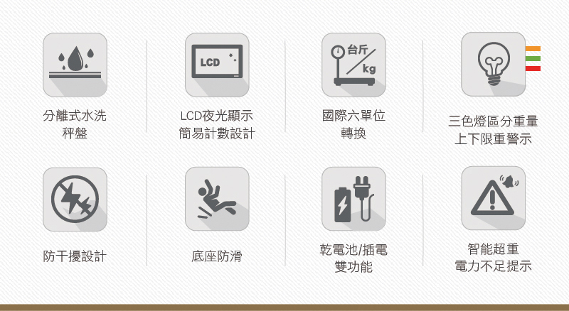 ‧ 台灣專用斤兩單位,國際專用6單位設計