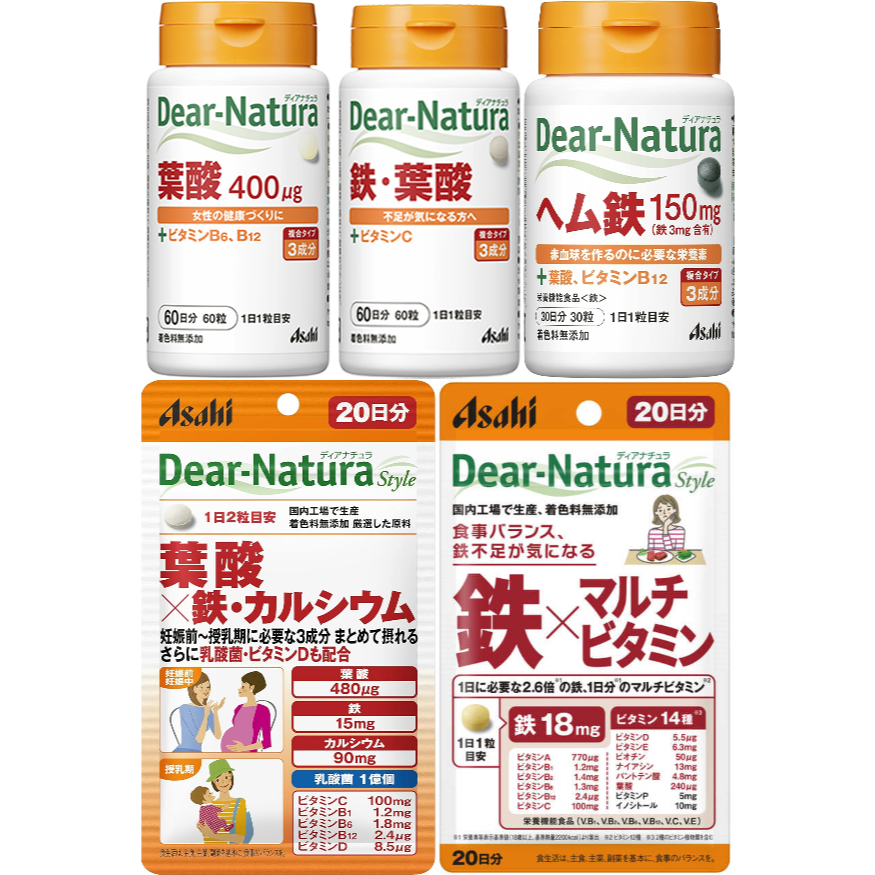 🍀袋裝/葉酸+鐵+鈣:每兩粒含有葉酸(480微克)、鐵(15毫克)、維生素B1(1.2毫克)、維生素B6(1.8毫克)、維生素B12(2.4微克)、維他命C(100毫克)、維他命D(8.5~20微克)、鈣(90毫克)、芽孢乳酸菌(1億個)。