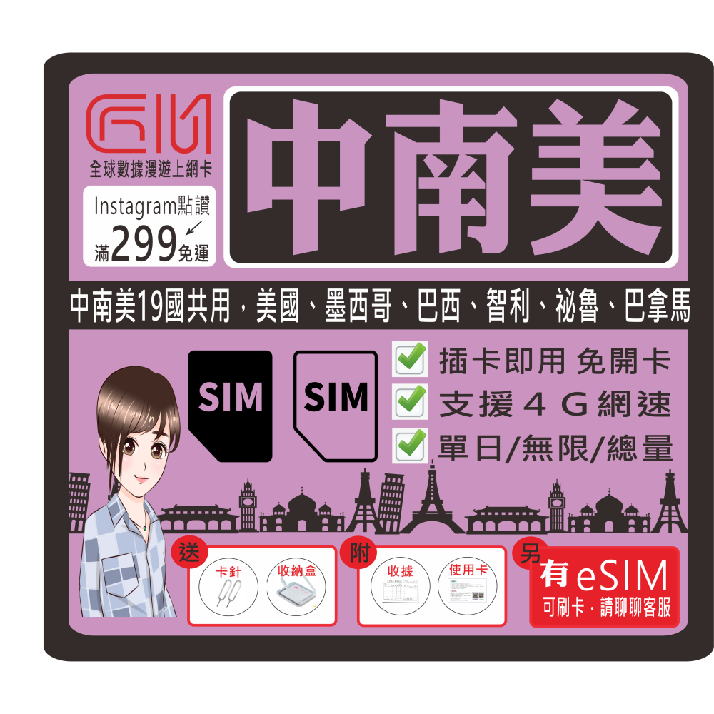 ├方案B┤中南美洲6國每天1GB流量型(輕量吃到飽)