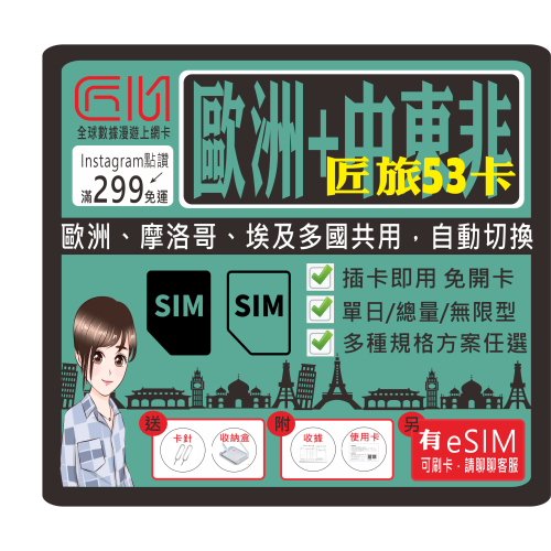 ├方案A┤歐中東非匠旅53卡✈︎總流量型✈︎共5GB用完降速