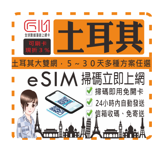 ├方案A┤土耳其大雙網每天1GB流量型(輕量吃到飽)