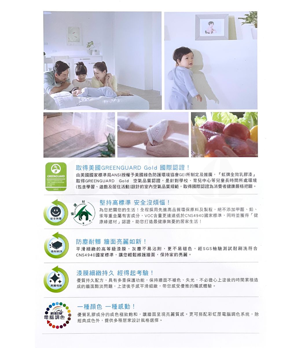 ●耐水、耐鹼性優良,保色性極佳,符合CNS 4940 規範