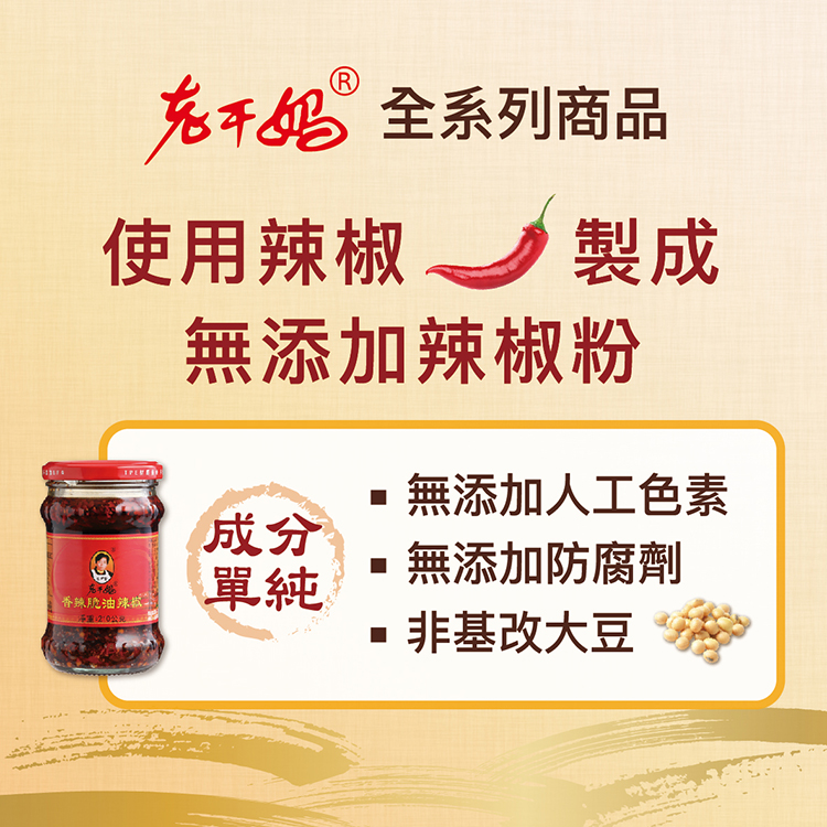 內容物名稱(成分):大豆油、辣椒、洋蔥、豆豉(大豆(非基因改造)、水)、L-麩酸鈉、食鹽、白砂糖、花椒