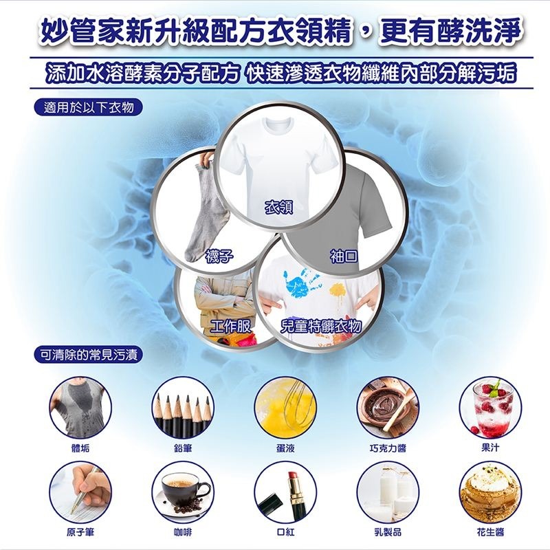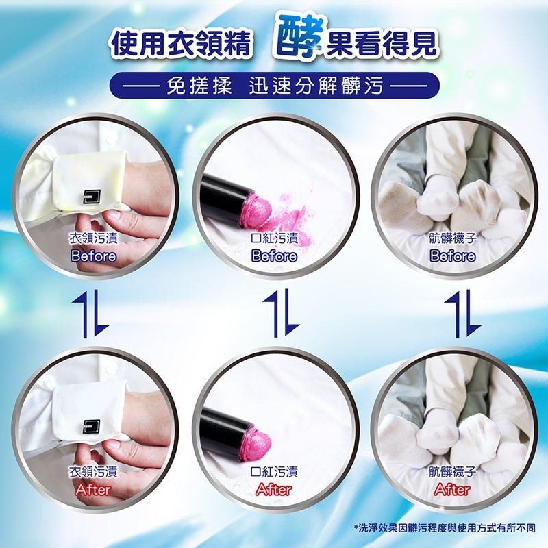 ◎水溶酵素分子配方:添加蛋白酵素,滲透衣物纖維內部,快速清潔衣領髒污。效果均佳。