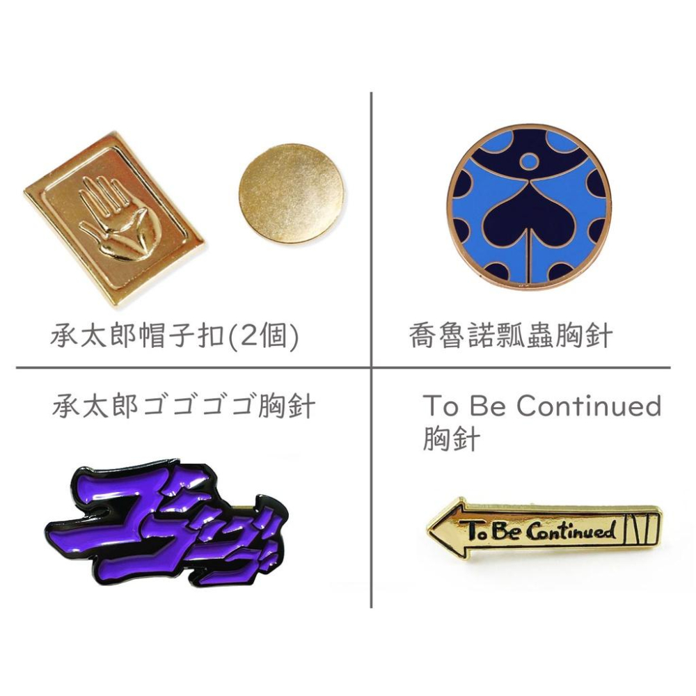 多種任選 ① 承太郎帽子扣(2個) 尺寸約2.5cm 80元 ② 喬魯諾瓢蟲 胸針 尺寸約3cm 80元 ③ ゴゴゴゴ胸針 尺寸約3cm 80元 ④ To Be Contiuned 胸針 尺寸約3cm 80元 ⑤ ①~④全帶 300元 ⑥ 替身之箭鑰匙圈  100元 類型: 胸針 / 徽章 材質: 鋁合金 運費可選擇 郵寄 則為25元的掛號寄出 15元以平信(無法追踪)寄出  ★隨機送專用保存袋