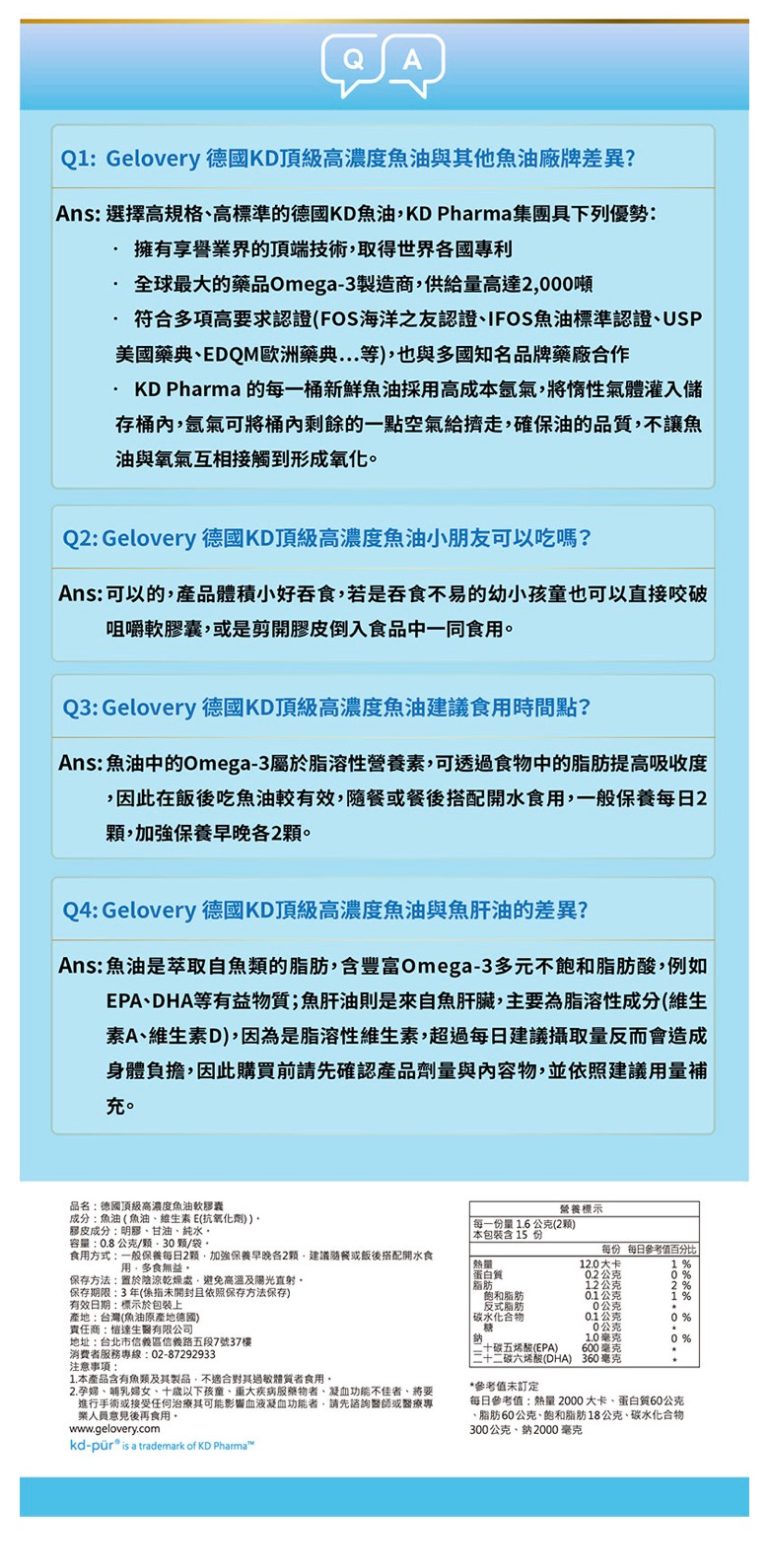 📌 每日建議攝取量 一般保健:每日 EPA + DHA 不超過 2 克 【關鍵成份(每份)】 專利德國KD Omega-3 1140 mg 以上 含 EPA 600 mg DHA 360 mg 【使用方式】 每日2顆。搭配常溫水食用。餐後食用較佳。 【警語】