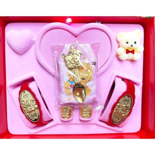 規格:彌月禮盒 一條項鍊、兩條手鍊,一對戒指。共五樣飾品