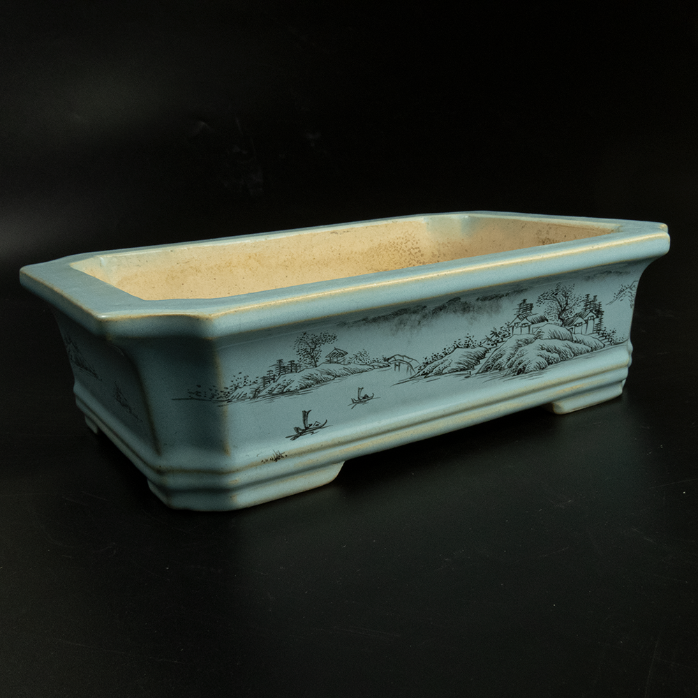 Description:李洪盆藝天青色山水描繪四方切角陶瓷盆 花盆