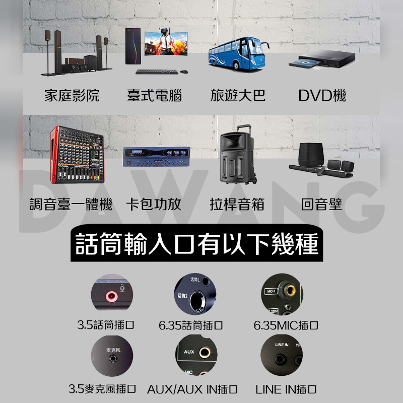 設有話筒接口設備均可連接使用:直播聲卡、錄放機、筆記本、調音臺、臺式電腦、卡包音箱、大巴、拉桿音箱