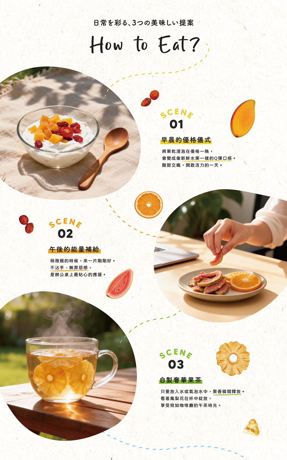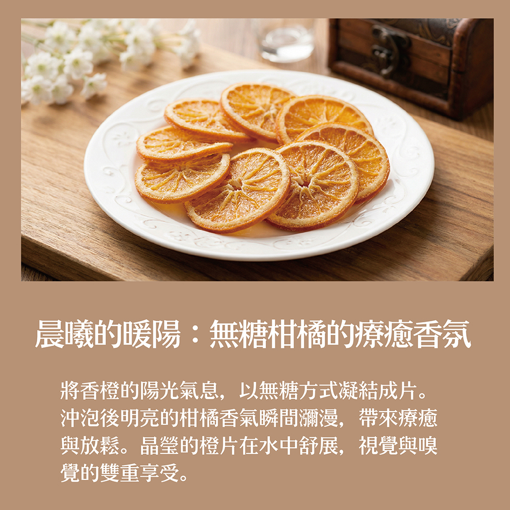 100%香橙原片低溫乾燥,片片可沖泡,散發清新果香。無糖、無香料,熱泡冷泡皆宜,也可搭配氣泡水製作果香飲品,是夏季清爽健康茶飲首選。