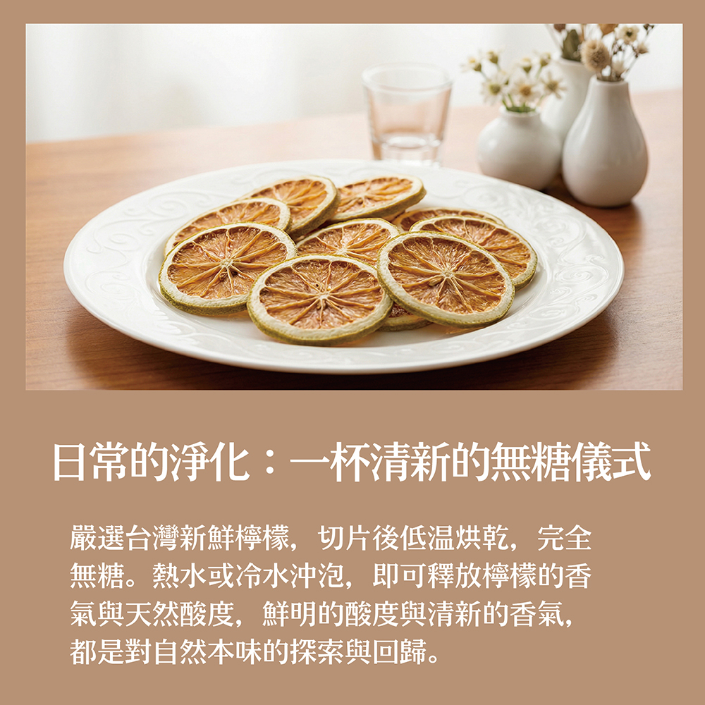 使用整顆檸檬低溫烘乾,完整保留酸香與果皮,可直接沖泡成酸爽飲品。無添加糖、防腐劑,適合日常代水飲用,是戒糖與體內環保的輕盈選擇。