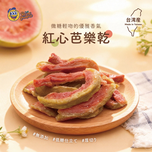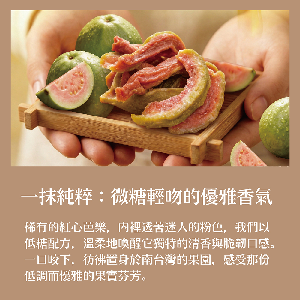 台灣紅心芭樂富含維生素C與膳食纖維,經低溫烘乾後口感扎實、香氣濃郁。微糖、無防腐劑與人工香料,是日常補充水果營養的絕佳選擇。