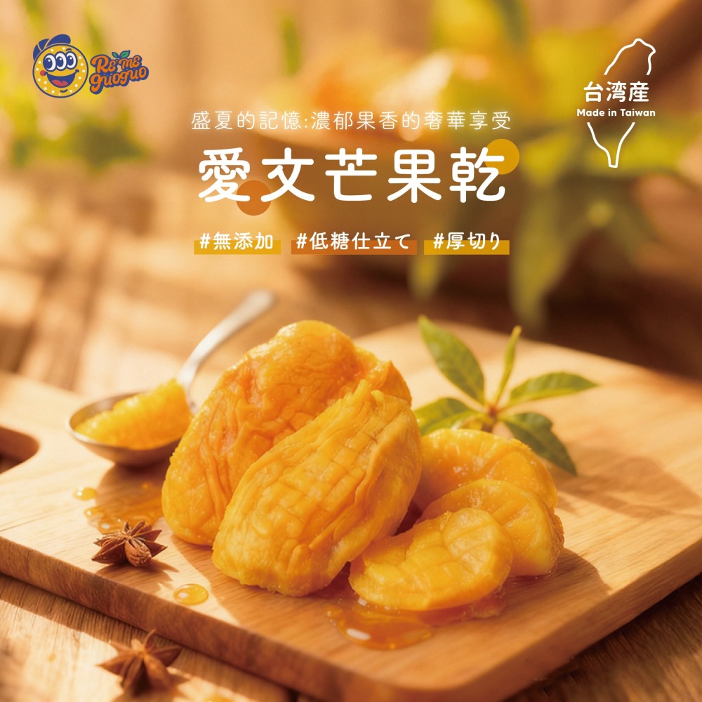 使用新鮮台灣愛文芒果,低溫乾燥鎖住濃郁果香與自然甜味。