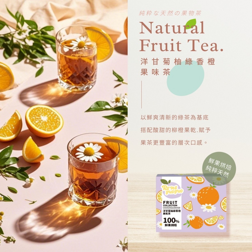 香橙片融合洋甘菊與柚子綠茶,果香與花草茶香交織,淡雅舒壓。無添加糖與人工香料,冷泡熱泡都合適,是夜間放鬆或下午茶時光的溫柔療癒果乾茶選擇。