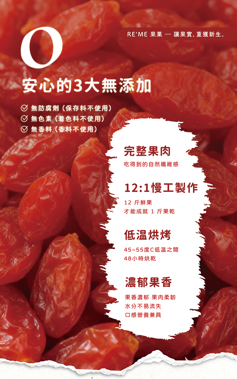 Re’me 小蕃茄乾採用新鮮小蕃茄低溫果漬,把果香、甜味、酸味完美濃縮,一口下去 Q 彈多汁、超級上癮。無香精、無色素、無負擔,下午茶、追劇、上班偷吃都 100% 無罪惡感!