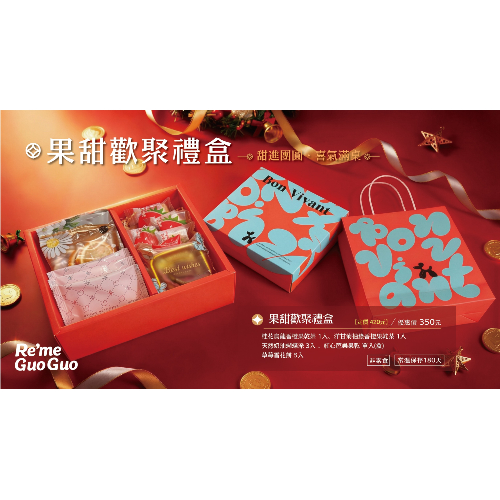 RE'ME 果菓 專為年節團聚時刻設計的「果甜歡聚禮盒」,以鮮明的橘紅色調與現代感十足的 Bon Vivant (美好生活) 字樣,傳遞熱情洋溢的節慶氛圍。這款禮盒是您在家庭聚會、朋友拜年時,分享甜蜜與歡樂的最佳選擇,讓每一口滋味都充滿喜氣。
