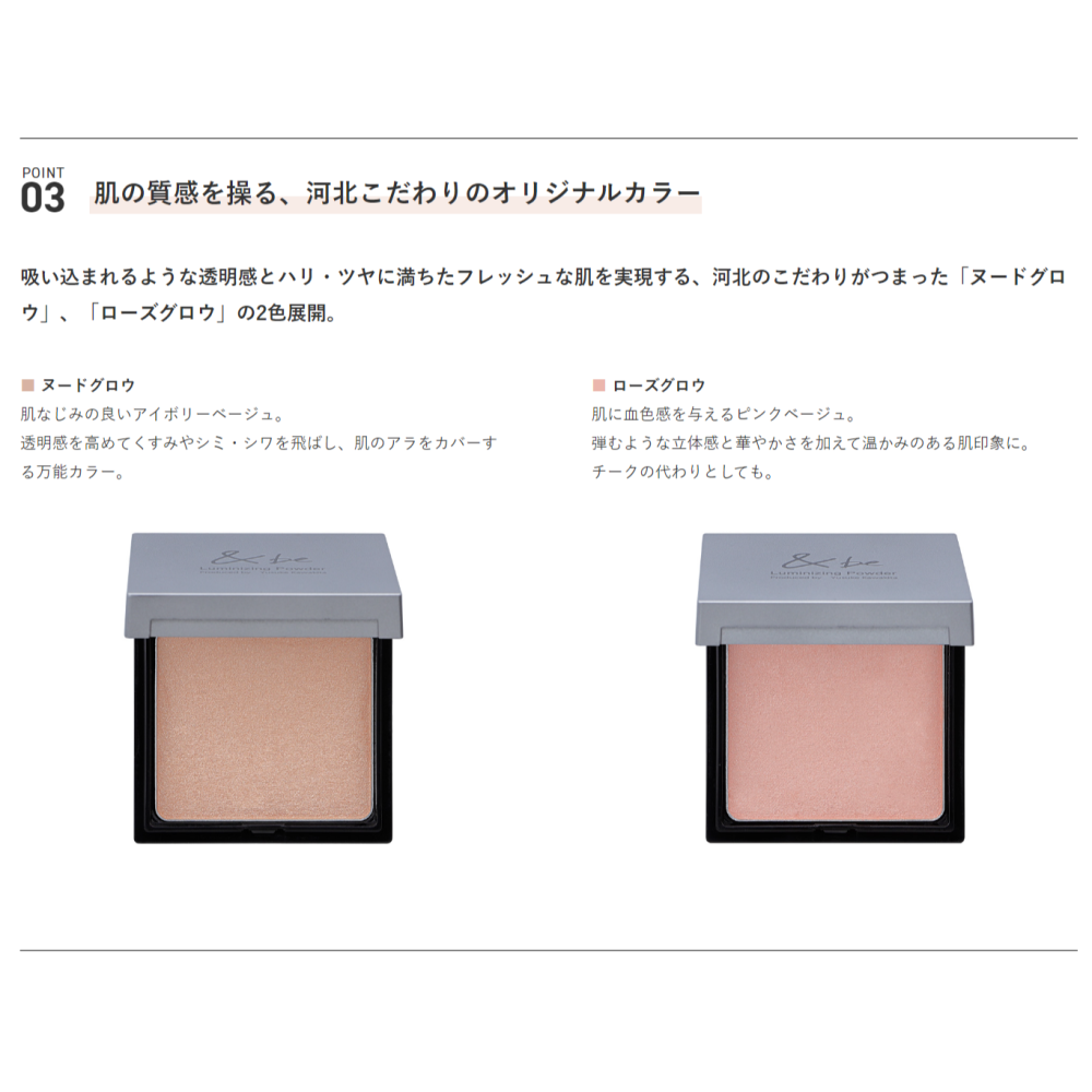 帶有些許的半霧面質感,適合任何場合的妝容。特別針對臉部骨架較前突且頰骨較高的日本女性所設計。