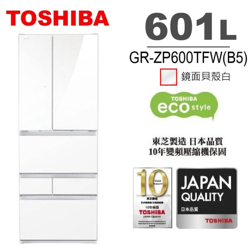 TOSHIBA 東芝GR-ZP600TFW(B5) 601公升無邊框玻璃六門變頻電冰箱 鏡面白