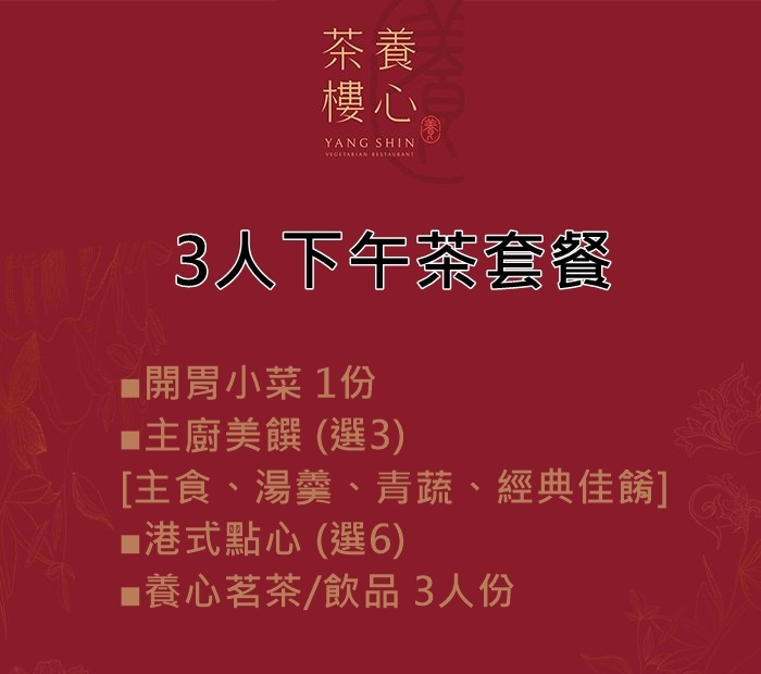 1.本券可3人於《養心茶樓蔬食飲茶》享用下午茶乙套。 (已含服務費)