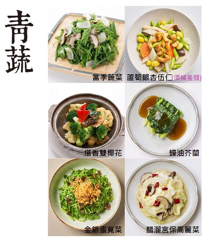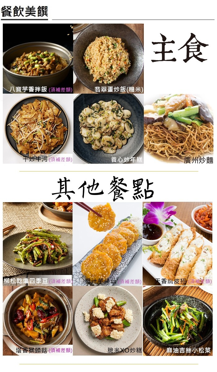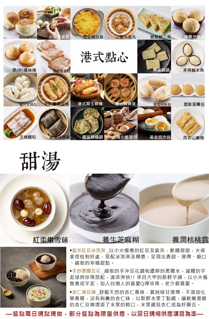 ■主廚美饌(選3) ■港式點心(選6) ■開胃小菜1份 ■養心茗茶/飲品3人份