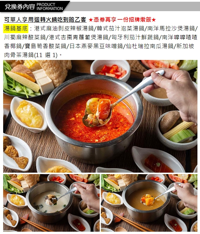 湯鍋基底:港式麻油剝皮辣椒湯鍋/韓式茄汁泡菜湯鍋/南洋馬拉沙煲湯鍋/川蜀麻辣酸菜鍋/港式杏棗青蘿蔔煲湯鍋/匈牙利茄汁鮮蔬鍋/南洋嚤嚤喳喳香椰鍋/寶島筍香酸菜鍋/日本燕麥黑豆味噌鍋/仙杜瑞拉南瓜湯鍋/新加坡肉骨茶湯鍋,十一選一。